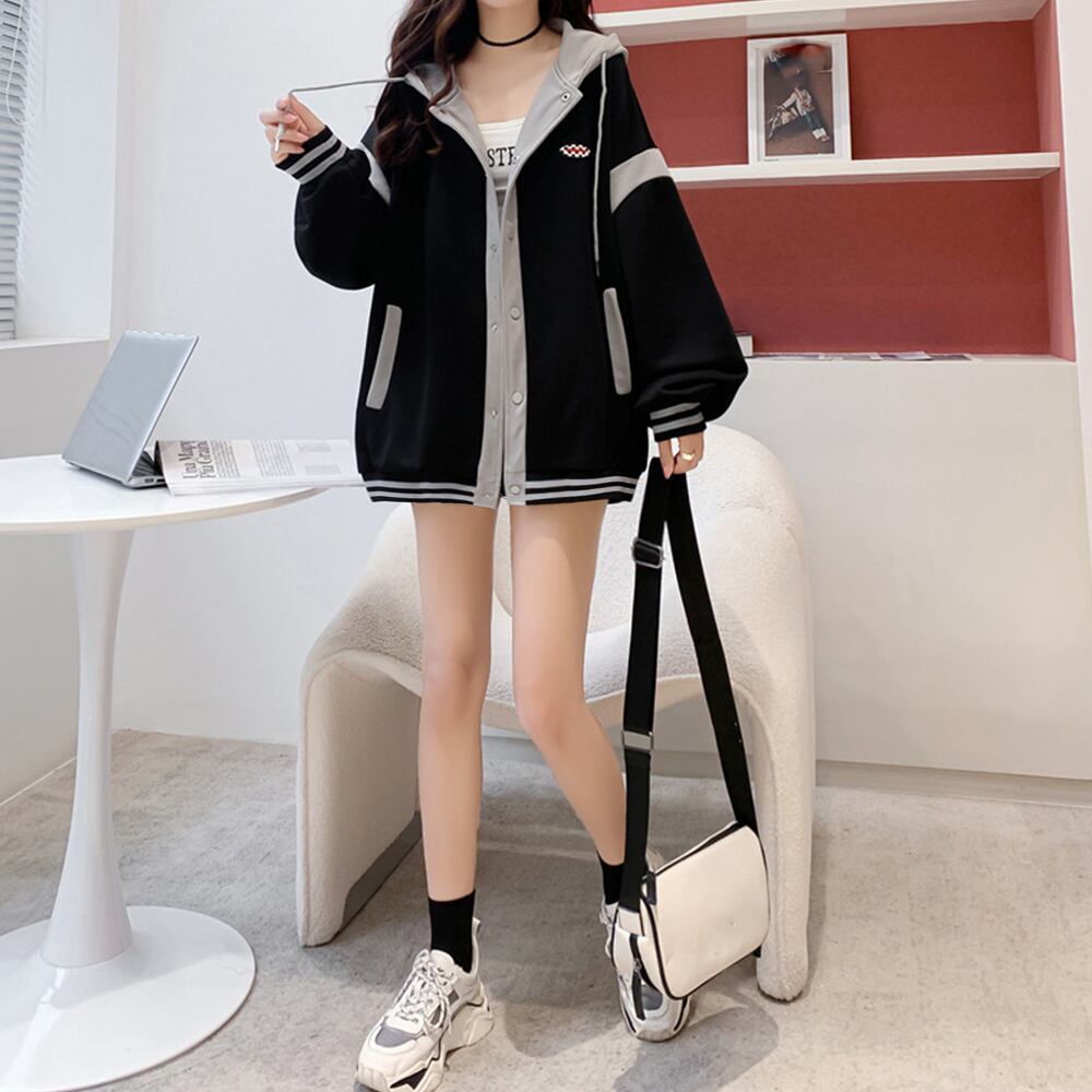 ゆったり 前開き フード付きトレーナー おしゃれ 韓国 ロゴ長袖トップス バイカラー フーディー 春秋アウター体型カバー