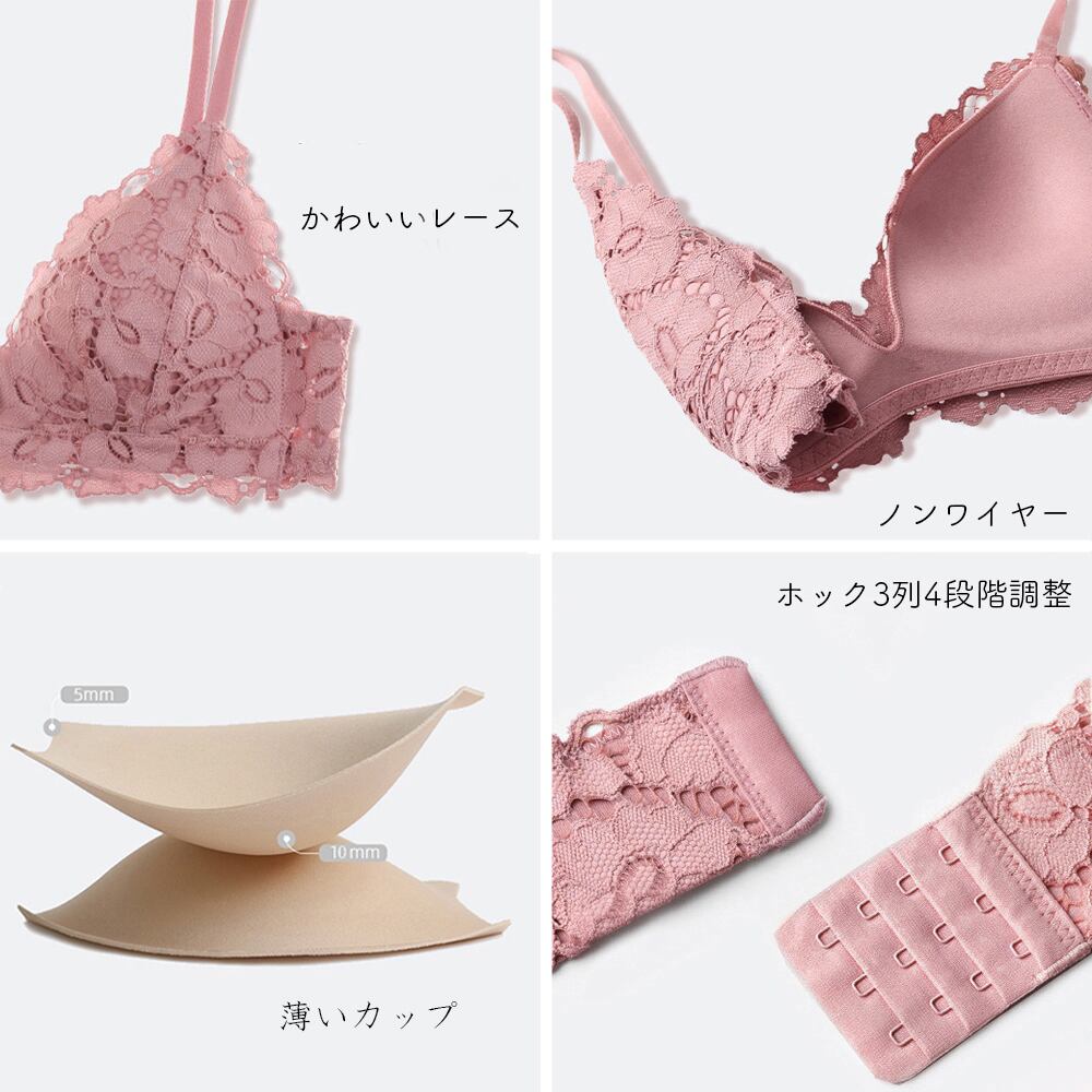 可愛い 総レース ノンワイヤー ブラジャー ショーツ 2点セット 谷間 ワイヤレス ブラショーツ 上下セット脇スッキリ