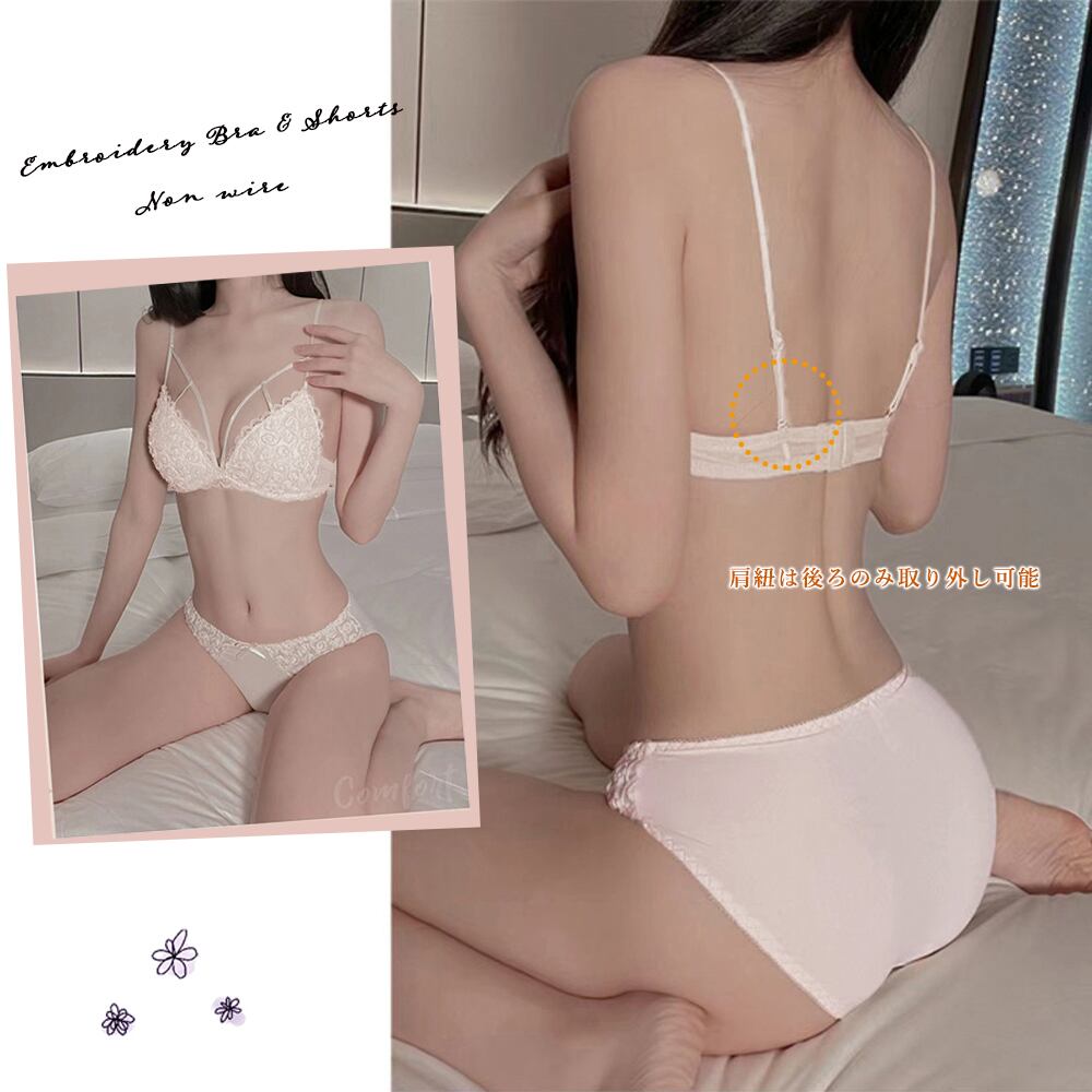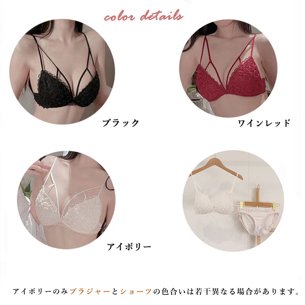 可愛い レースブラジャー ショーツ 上下セット ノンワイヤー 細ストラップ ブラセット美胸谷間 プッシュアップブラ盛れる