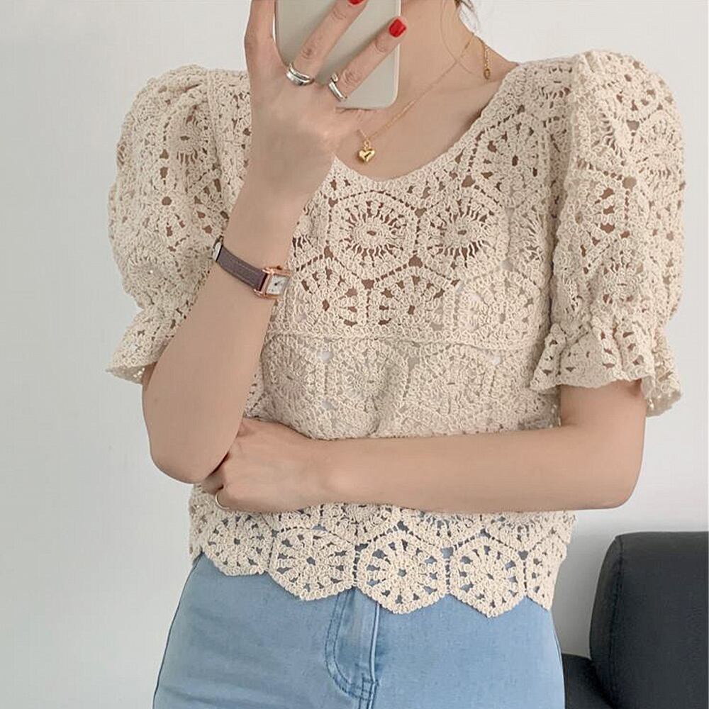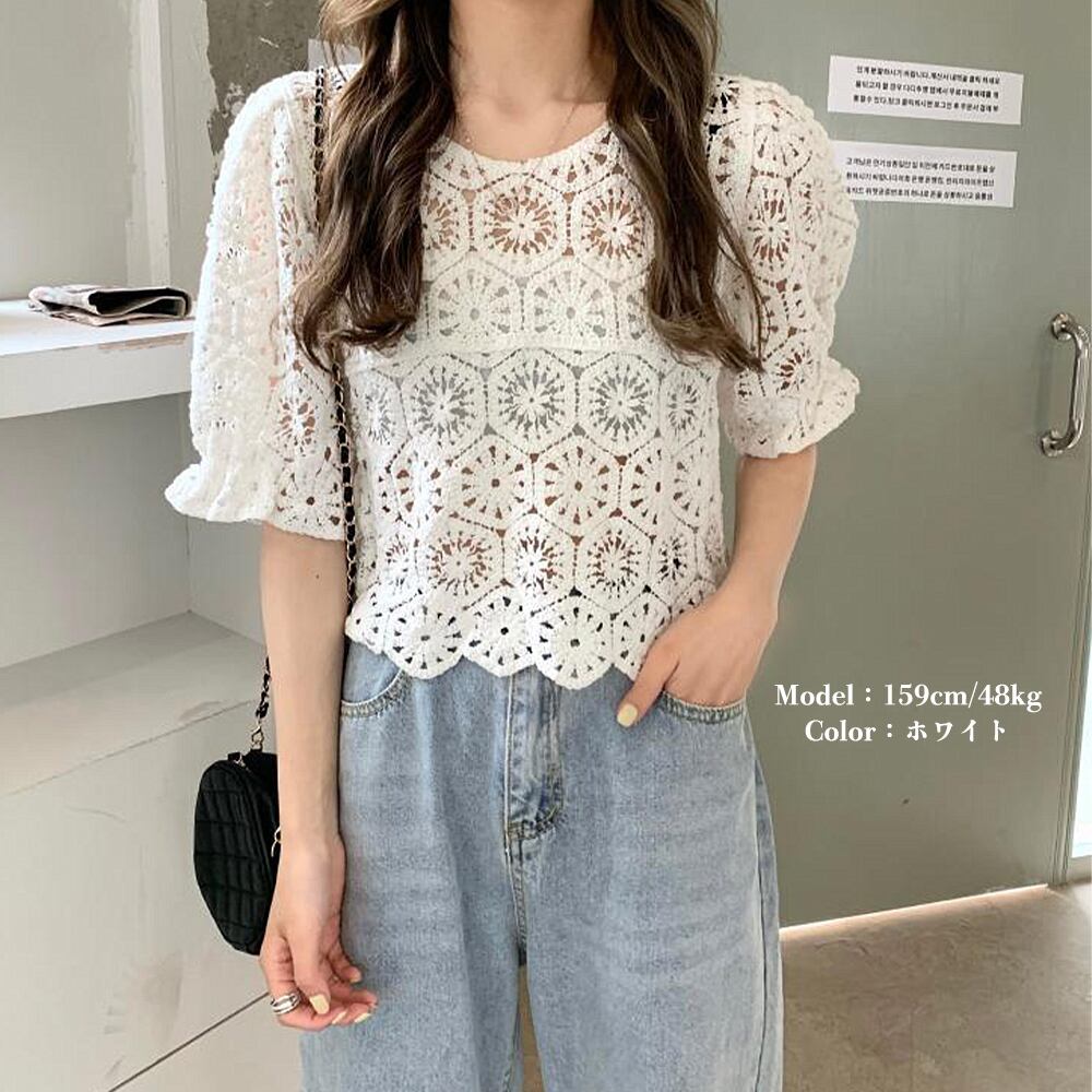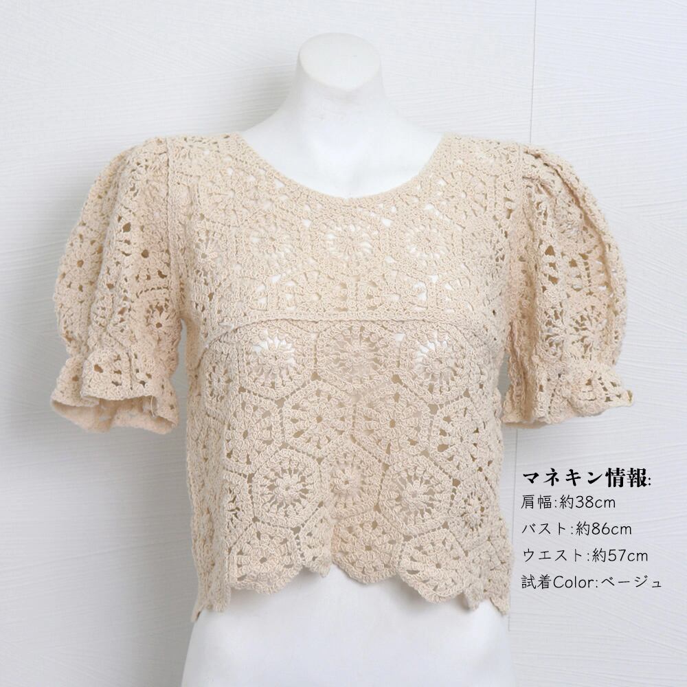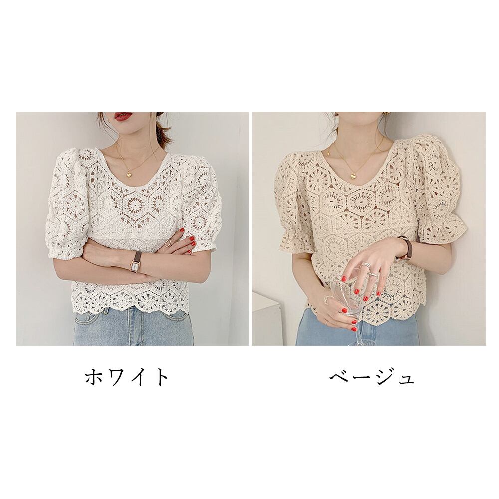 レディース クロシェニット 透かし編み パフスリーブ 可愛い 涼しい リゾート カジュアル お洒落 着やせ 無地 大人