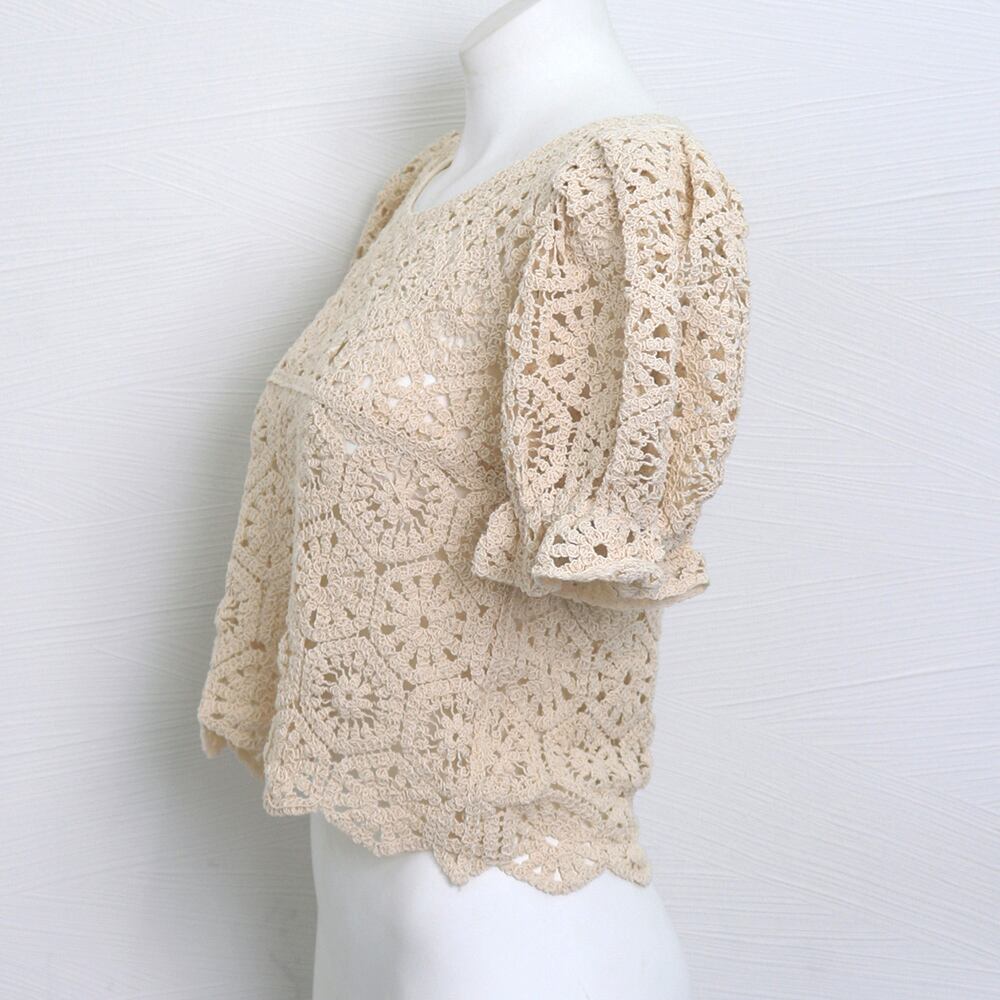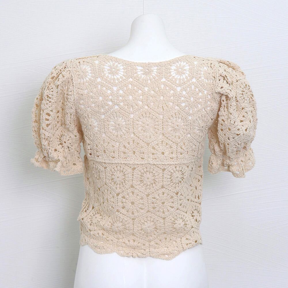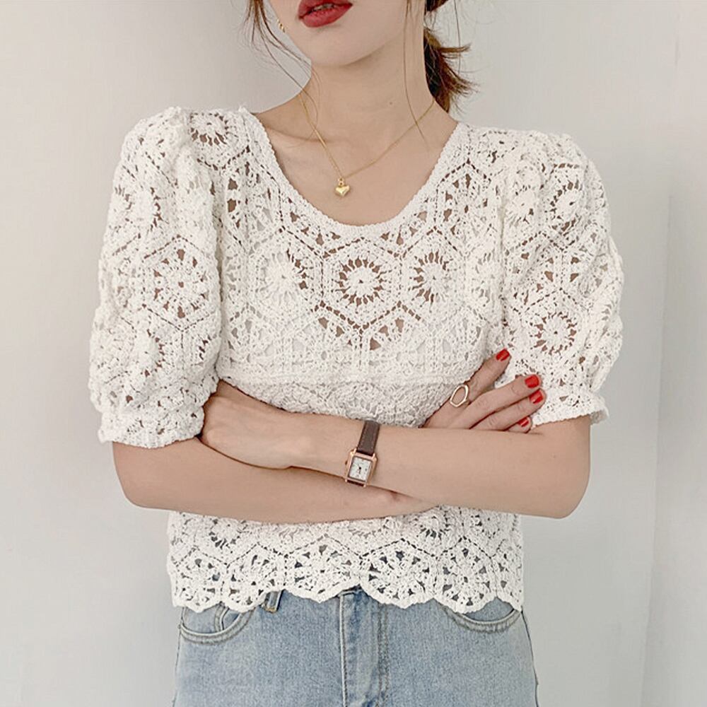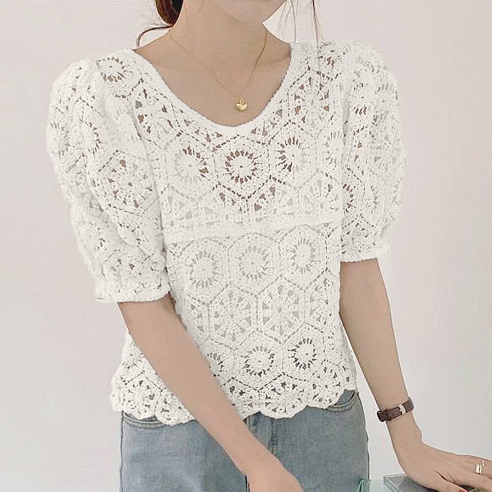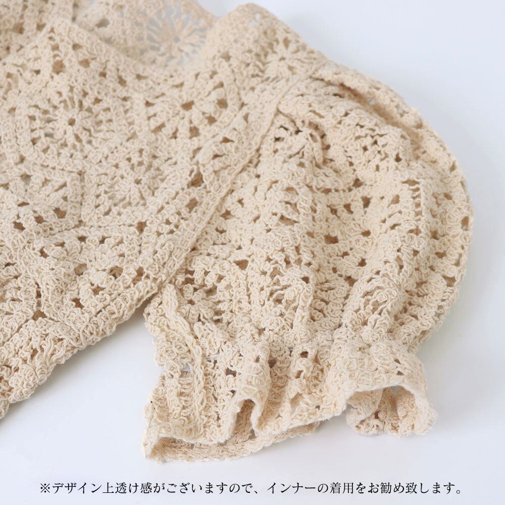 レディース クロシェニット 透かし編み パフスリーブ 可愛い 涼しい リゾート カジュアル お洒落 着やせ 無地 大人
