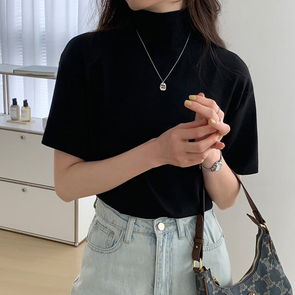 首元がハイネックデザインのシンプル五分袖Tシャツ