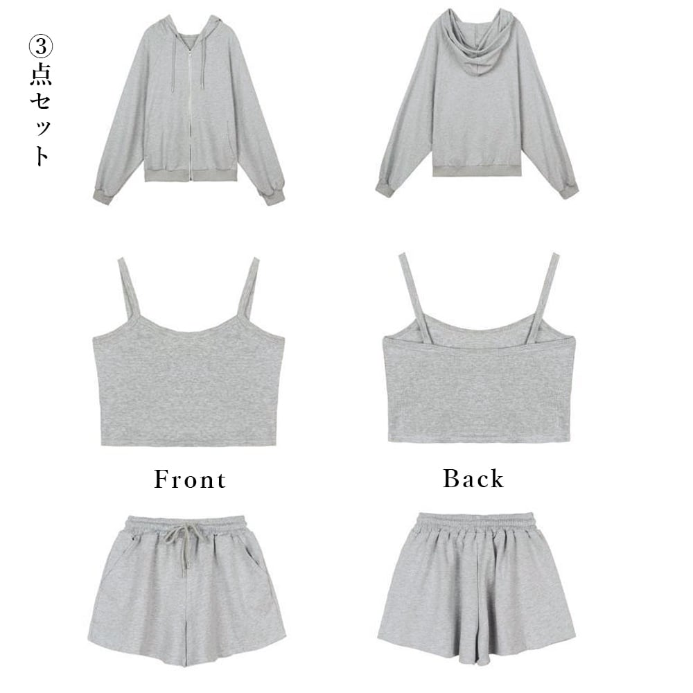 可愛い 部屋着セット 長袖 ルームウェア カジュアル ジップアップパーカー ショート丈キャミソール ショートパンツ 春夏