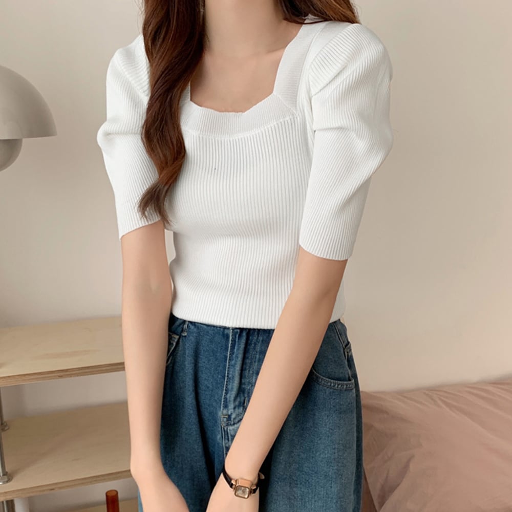 【日本倉庫即納】 スクエアネック サマーリブニットトップス