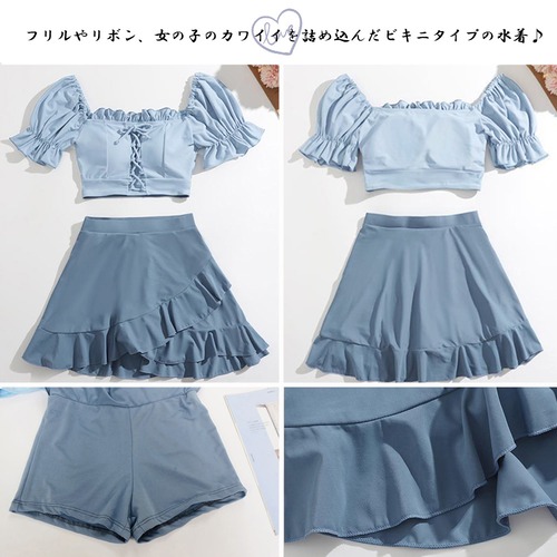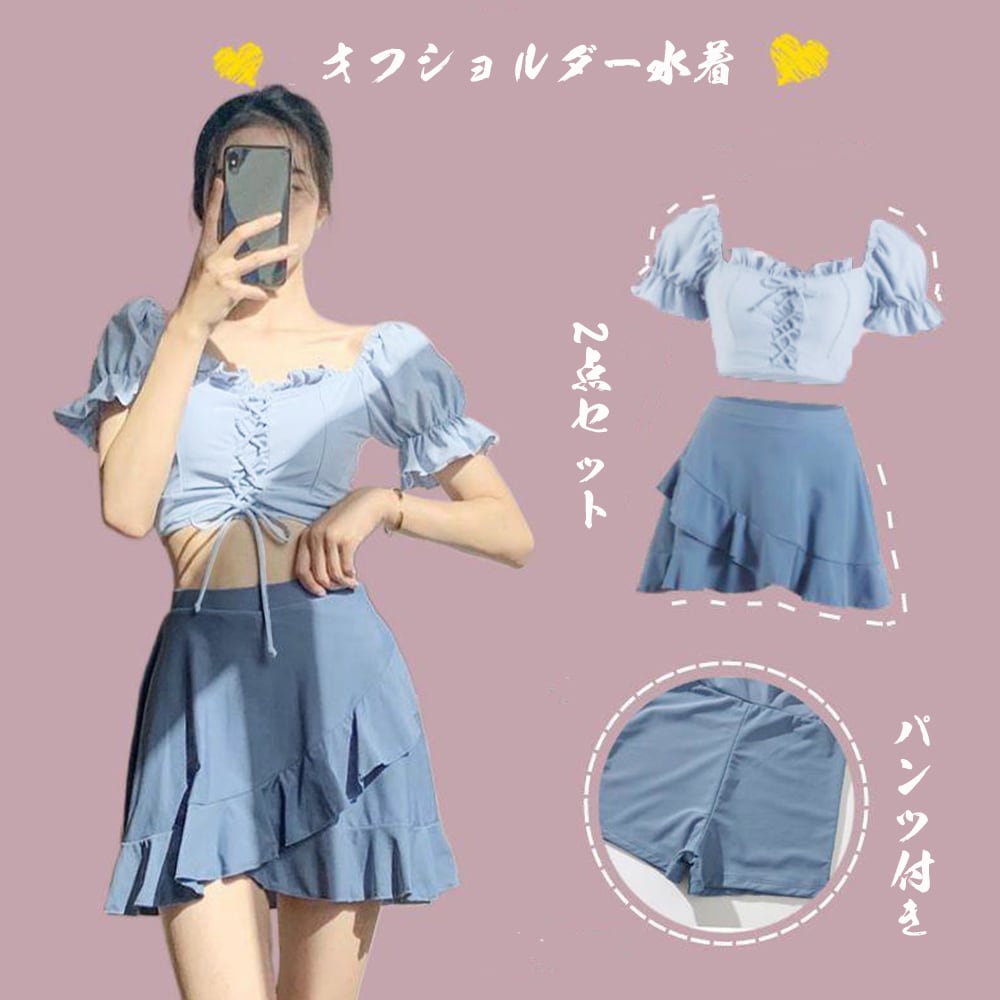 レースアップ水着 2点セット オフショルトップス パンツ付き フリルミニスカート セパレート水着 露出控えめビーチウェア