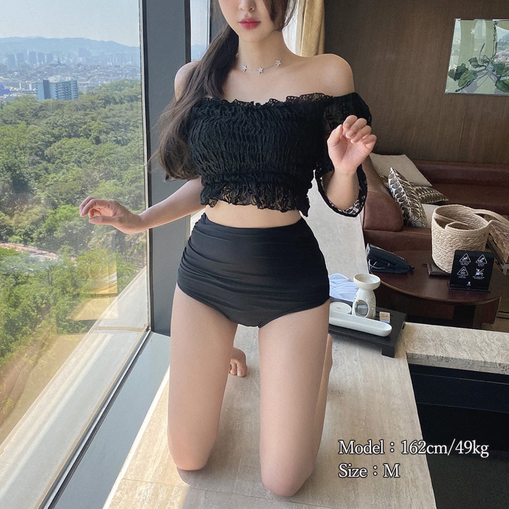 レースシャーリングトップス ハイウエストショーツ スイムウェア 露出控えめ 2wayビキニ 20代30代40代 ママ水着