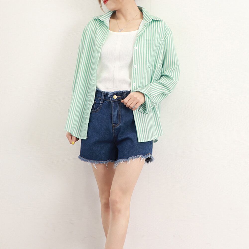 レディース グリーンストライプシャツ カジュアル 長袖シャツ 韓国 春夏 シャツカーディガン 薄手 おしゃれ ストリート