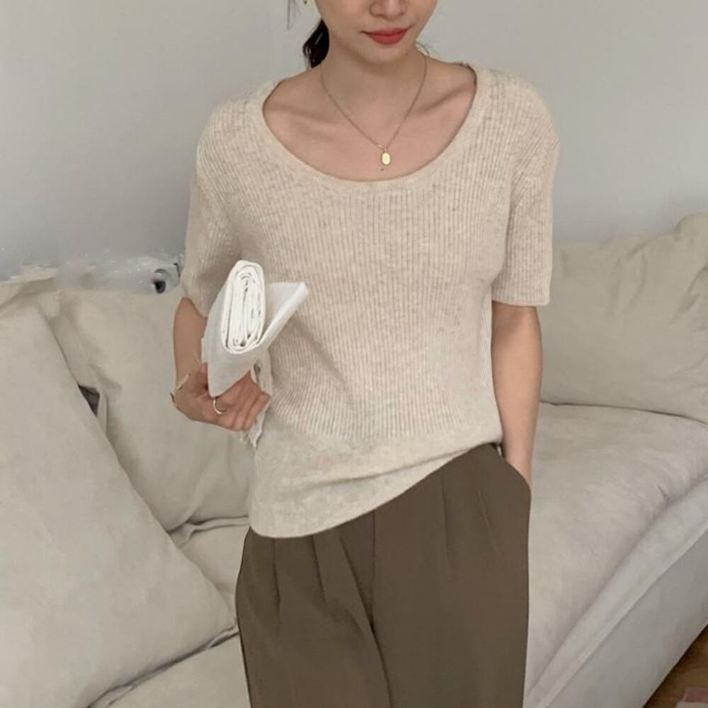 Uネック リブニットTシャツ 韓国カットソー 無地 ベーシック 夏トップス 柔らかい薄手 大人カジュアル着やせ 6色展開