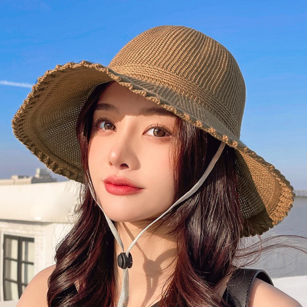 あご紐付きで好みの長さに調整可能、風が強い日や自転車でも飛ばされにくく安心。