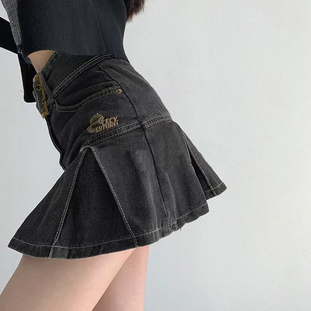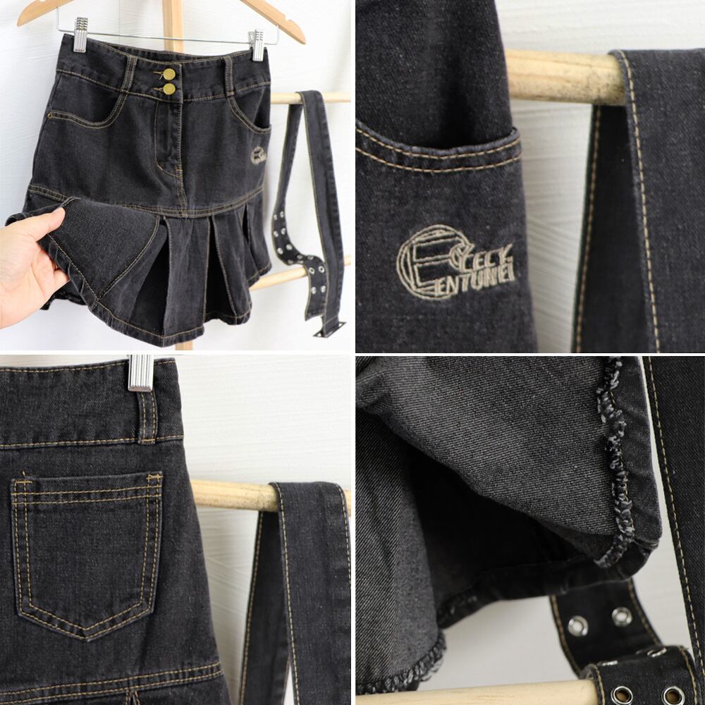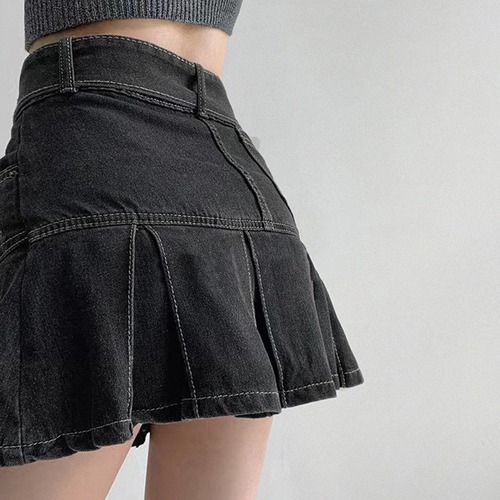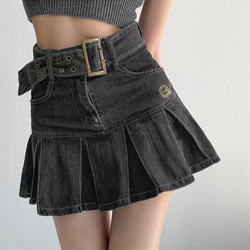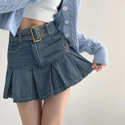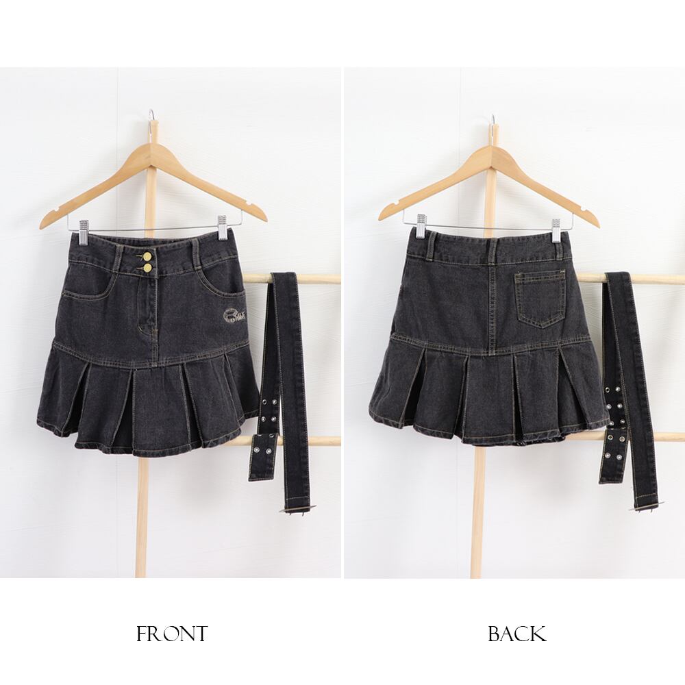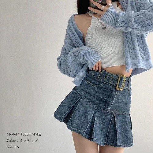 【日本倉庫即納】 ミニデニムプリーツスカート ベルト付き