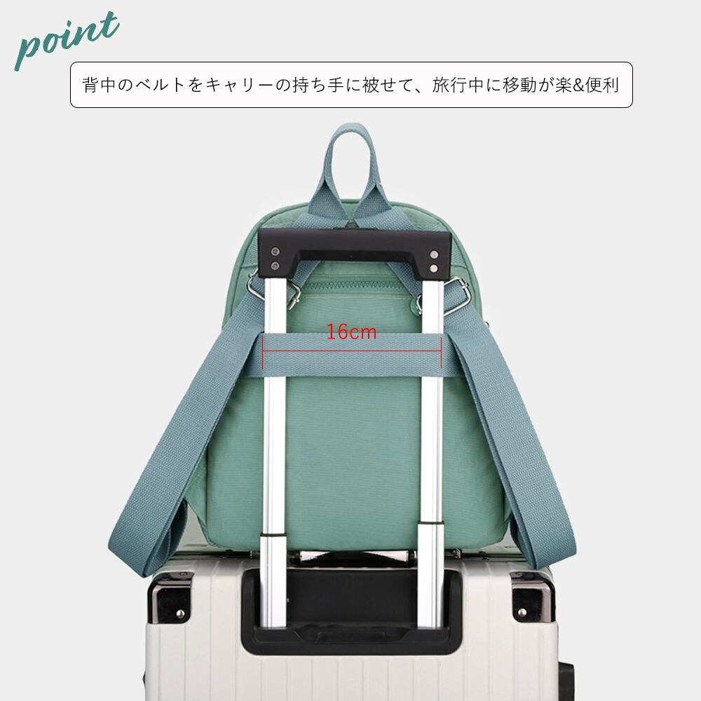 背中のベルトをキャリーの持ち手に被せて、旅行中に移動が楽&便利