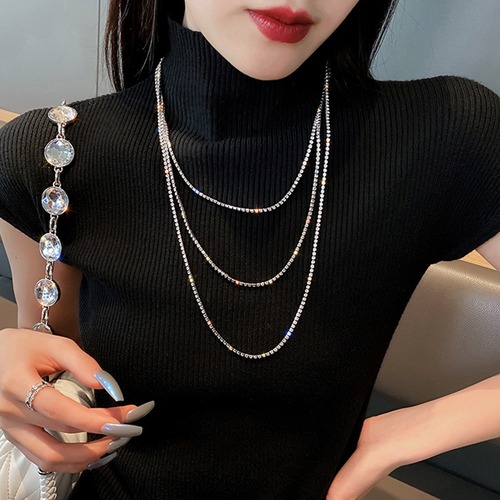 上品に輝くビジューで甘すぎずモードなスタイルにも似合う3連チェーンネックレス