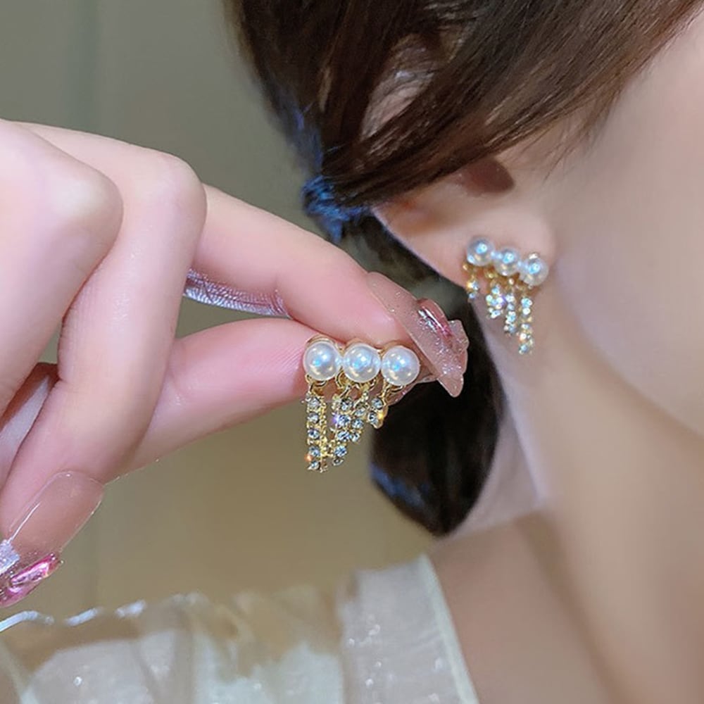 カーブに沿った上品な3連なるフェイクパールときらきら輝くラインストーンが目を引く