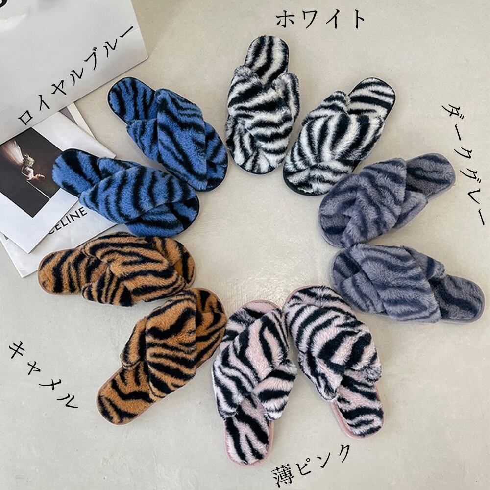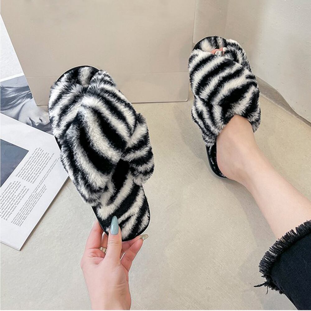 全体にフェイクファーをあしらった、温かな履き心地、大人気な、ゼブラ柄のスリッパサンダル