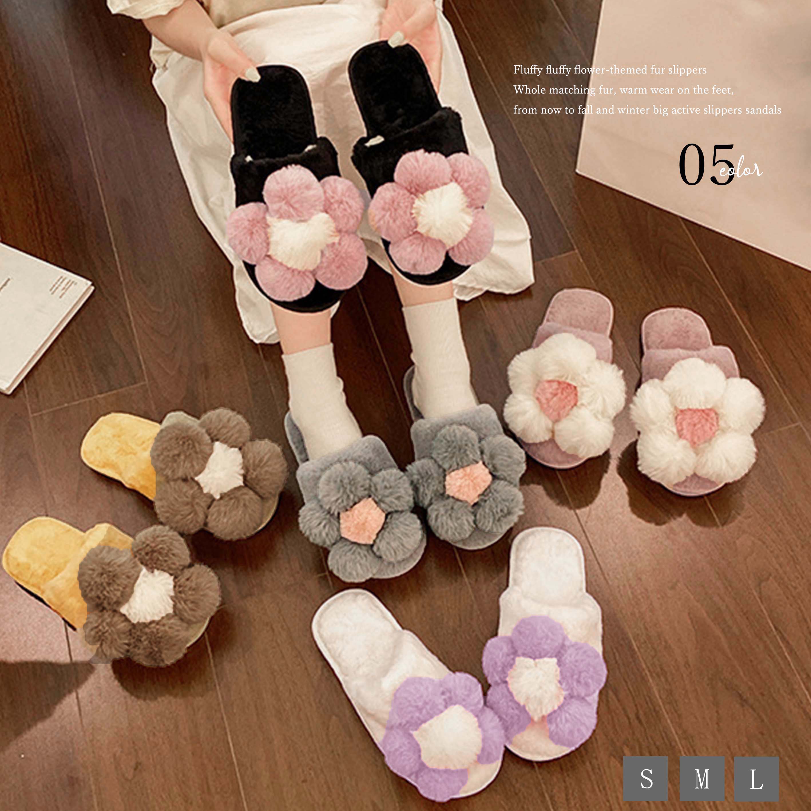 ふわふわのボリューム感でお花モチーフデザインのファースリッパ