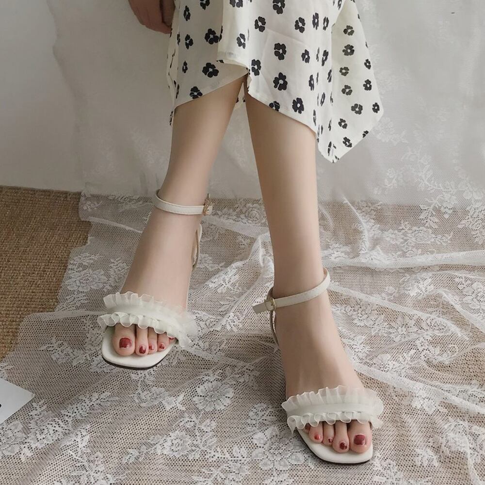 サマーサンダル 太ヒール 夏 美脚 歩きやすい 可愛い 人気 フリル ローヒール おしゃれ