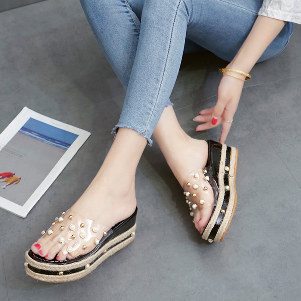 パールスタッズにクリア素材のレディースライクなウェッジヒールサンダル