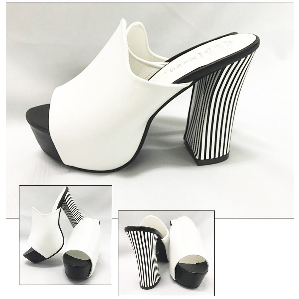 縞模様のヒールが可愛い、山型の甲深チャンキーヒールサンダルで美脚&脚長効果も◎