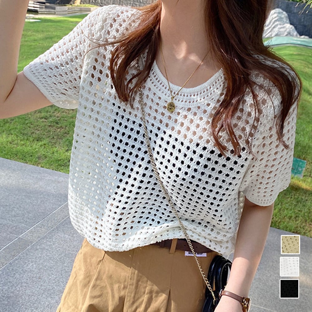 穴あき ショート丈トップス 無地クルーネック 透かし編みニットプルオーバー 春夏秋 透け感 おしゃれ きれいめカジュアル