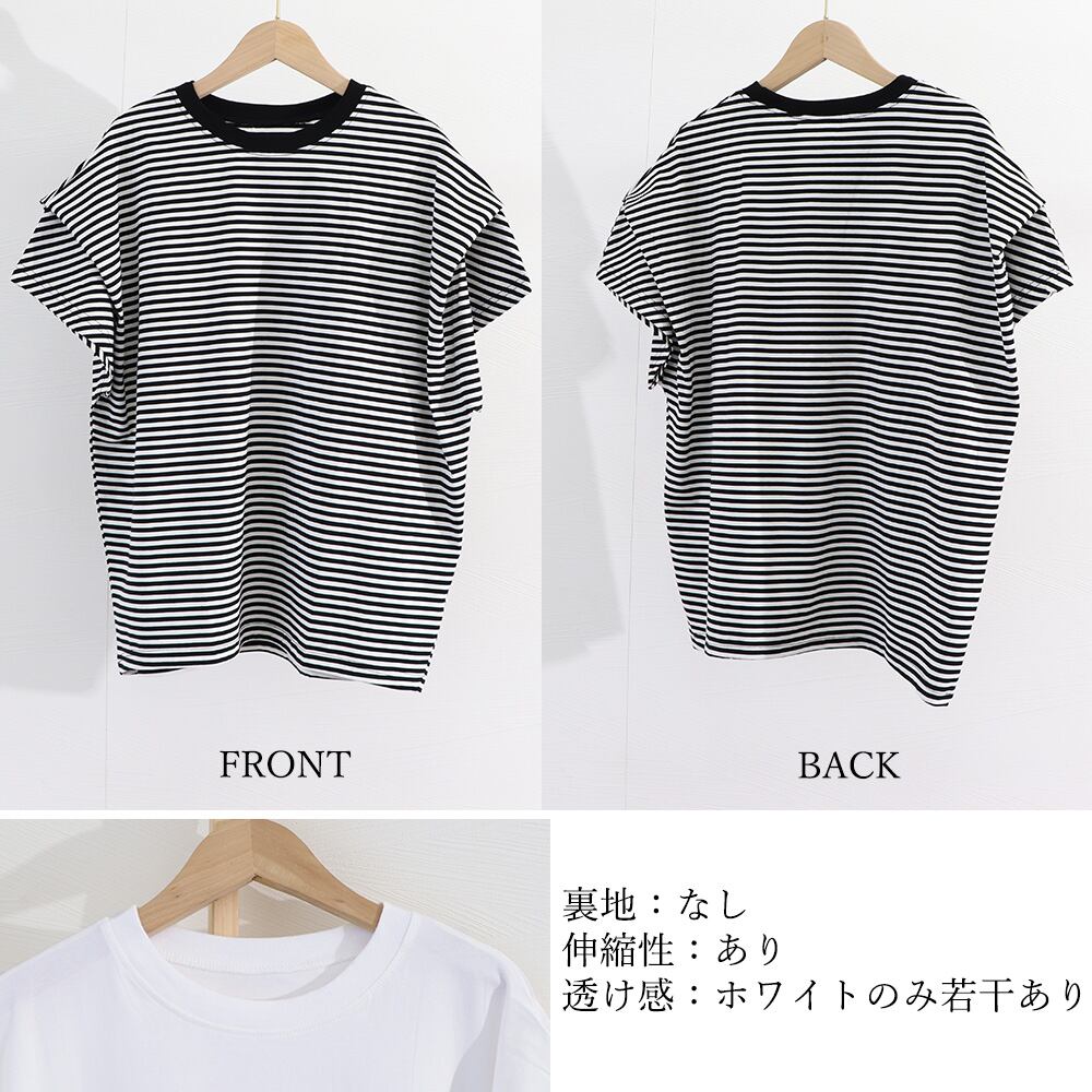 ボーダー柄トップス プルオーバーラウンドネック フレンチ袖 肩タック カットソー シンプルカジュアル通勤通学クルーネック
