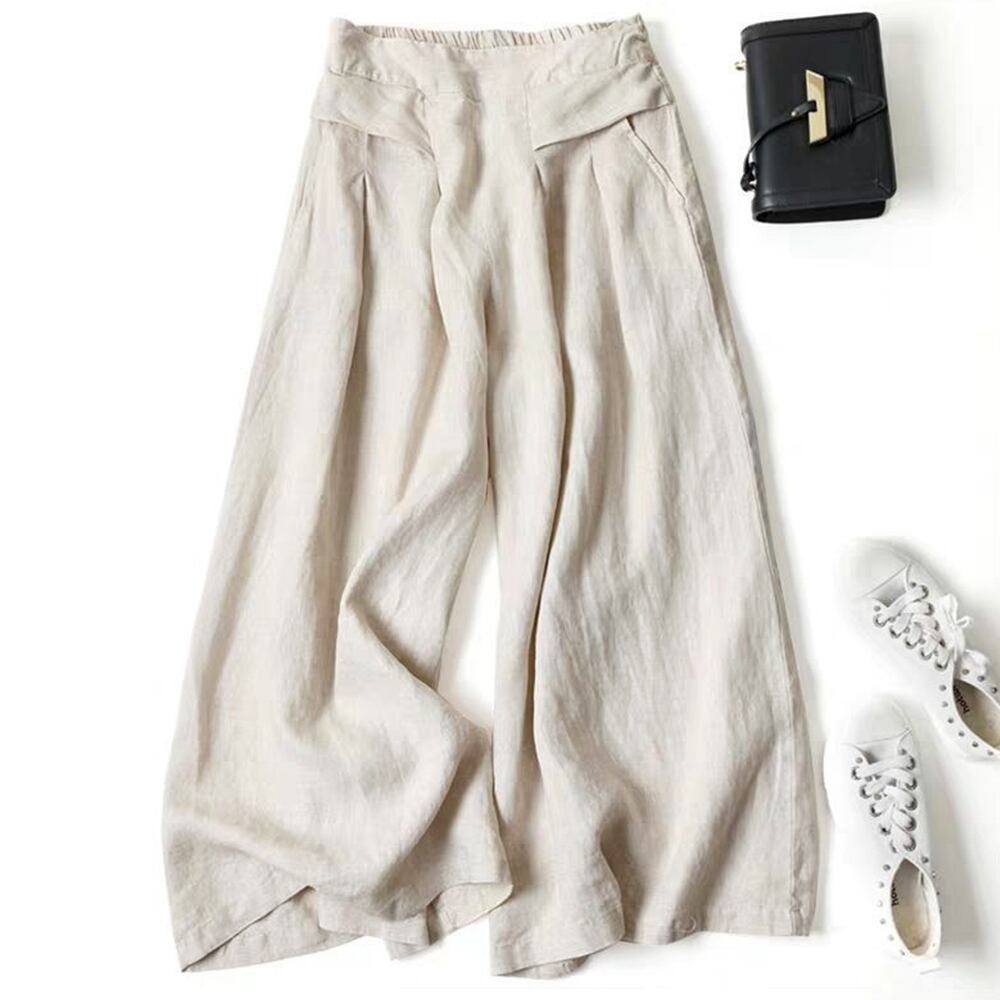 おしゃれ リネンスカーチョ 体型カバー レディース ゆったり ハイウエスト ロングパンツ ウエストゴムズボンフレアパンツ