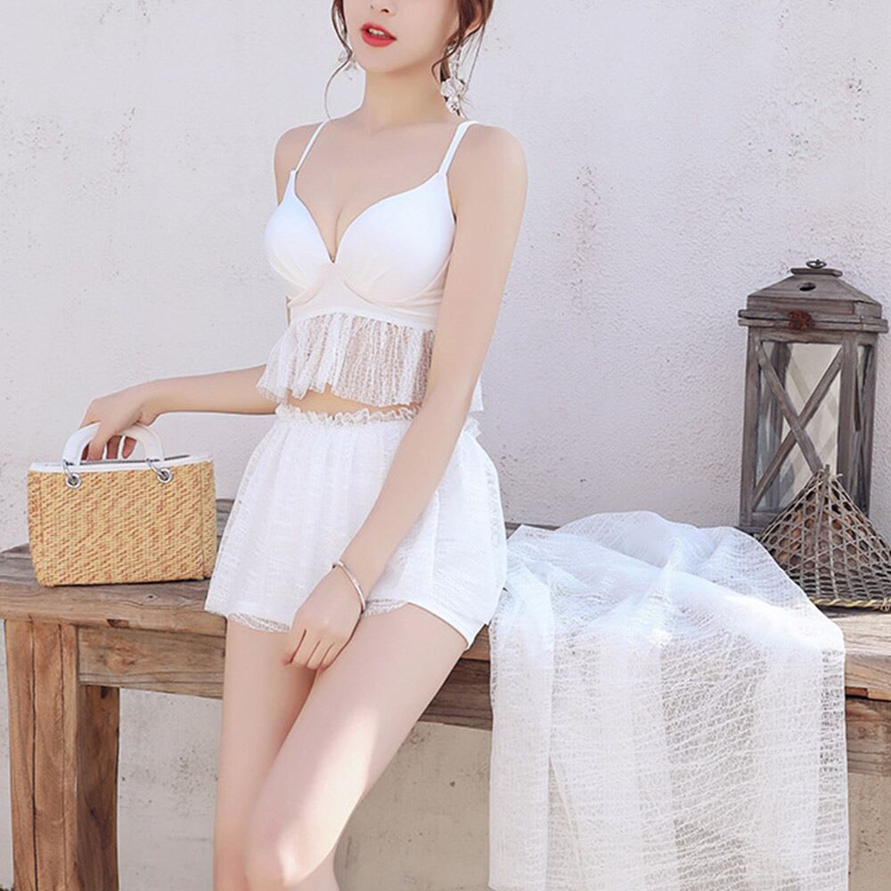 可愛いビキニ シフォン生地 セパレート スイムウエア ブラトップ ボクサーパンツ 7色 無地 水着 温泉 大人