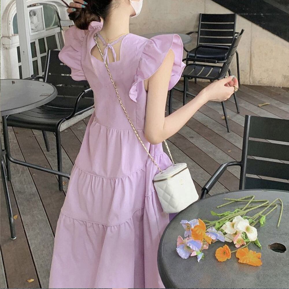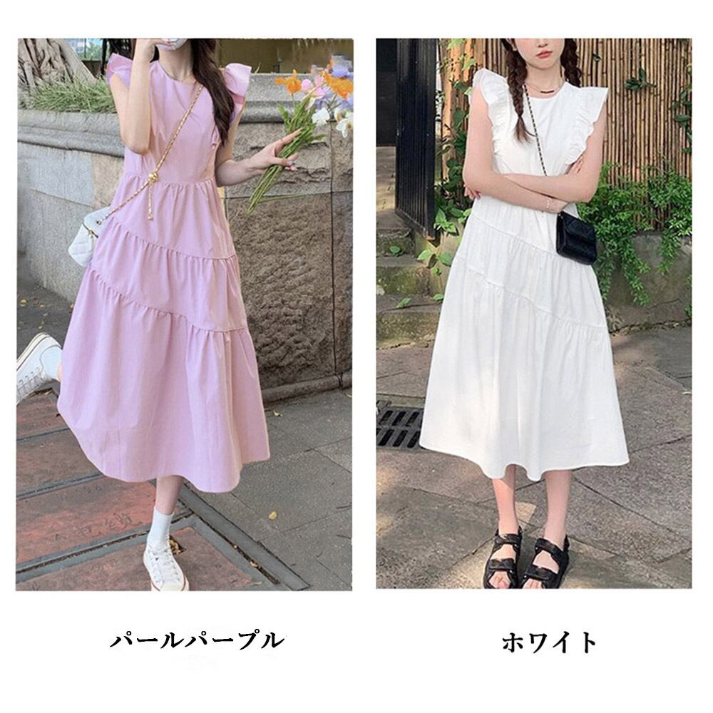 レディース ロング丈ワンピース ふんわり フリル袖 カジュアル ウエスト高め 二次会 タック きれいめ ミモレワンピース
