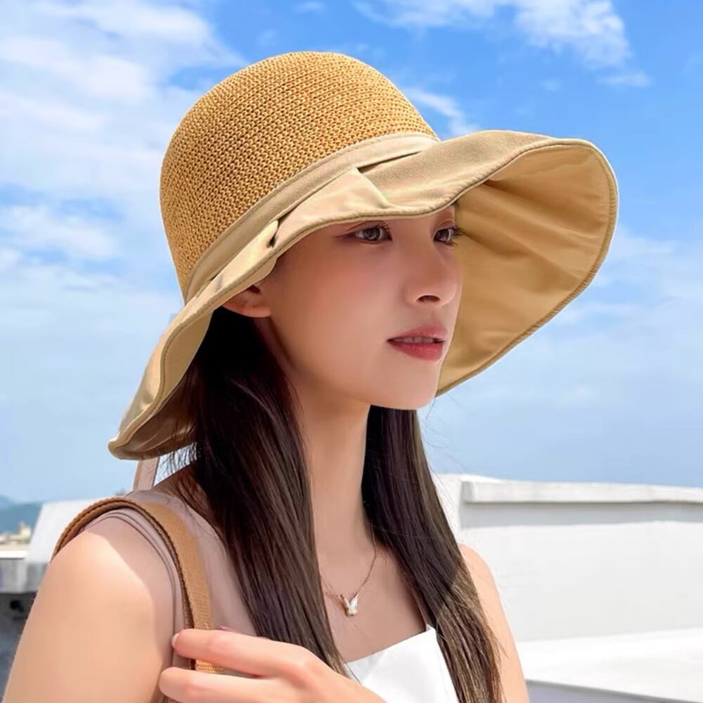 広いつばがタック仕様Design、被った時の華やかさとオシャレ見えは間違いなしの異素材日よけ帽子