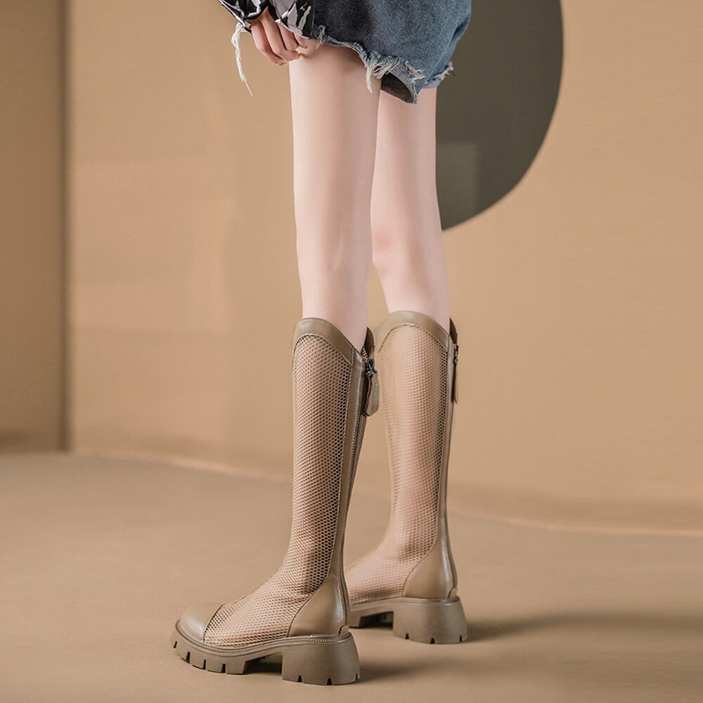 メッシュとレザーの異素材mixの韓国風サマーニーハイブーツ