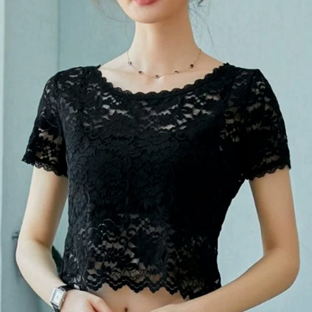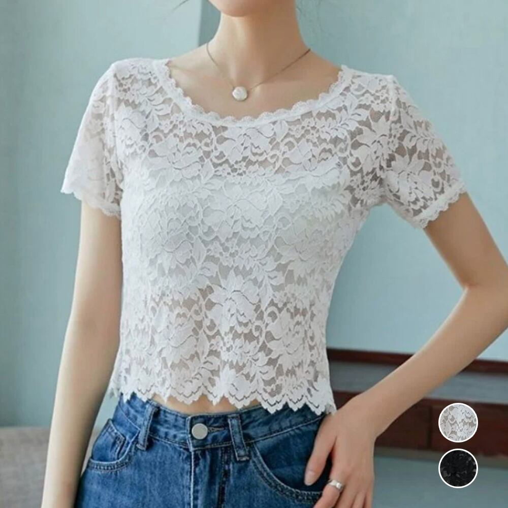 繊細なレース素材を使用、大人っぽくフェミニンに仕上げた半袖ブラウス