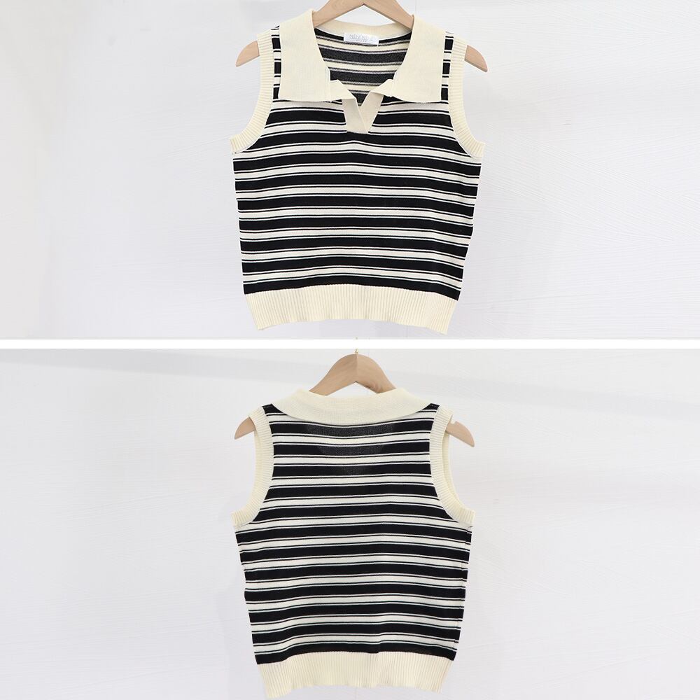 襟付き ボーダーニット 袖なしショート丈トップス レディース プチプラ クロップド丈カットソー 1枚で決まる ポロシャツ