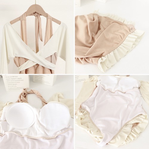 胸元のクロスと裾のフリル仕様で、大人かわいい長袖ワンピース水着