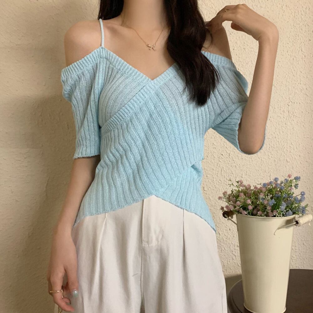 【日本倉庫即納】 サマーニットオフショルダーニットトップス