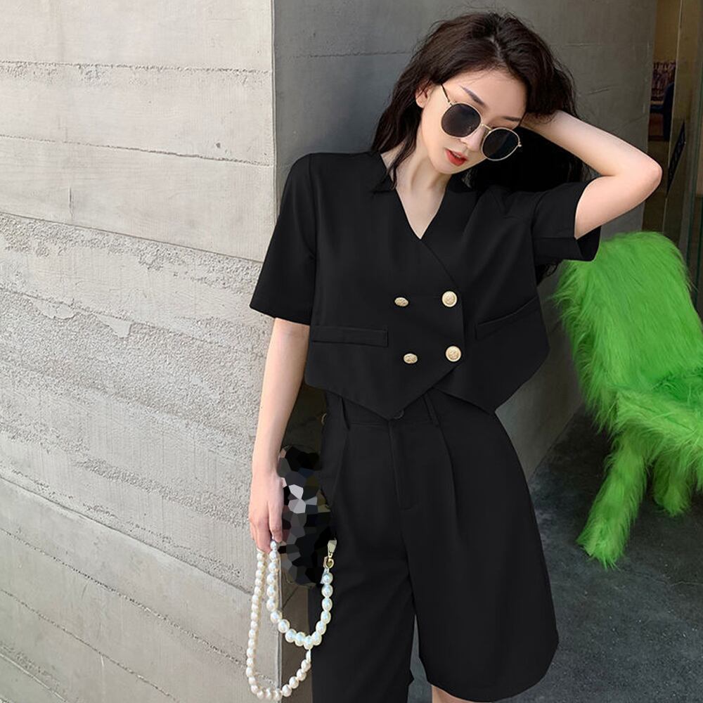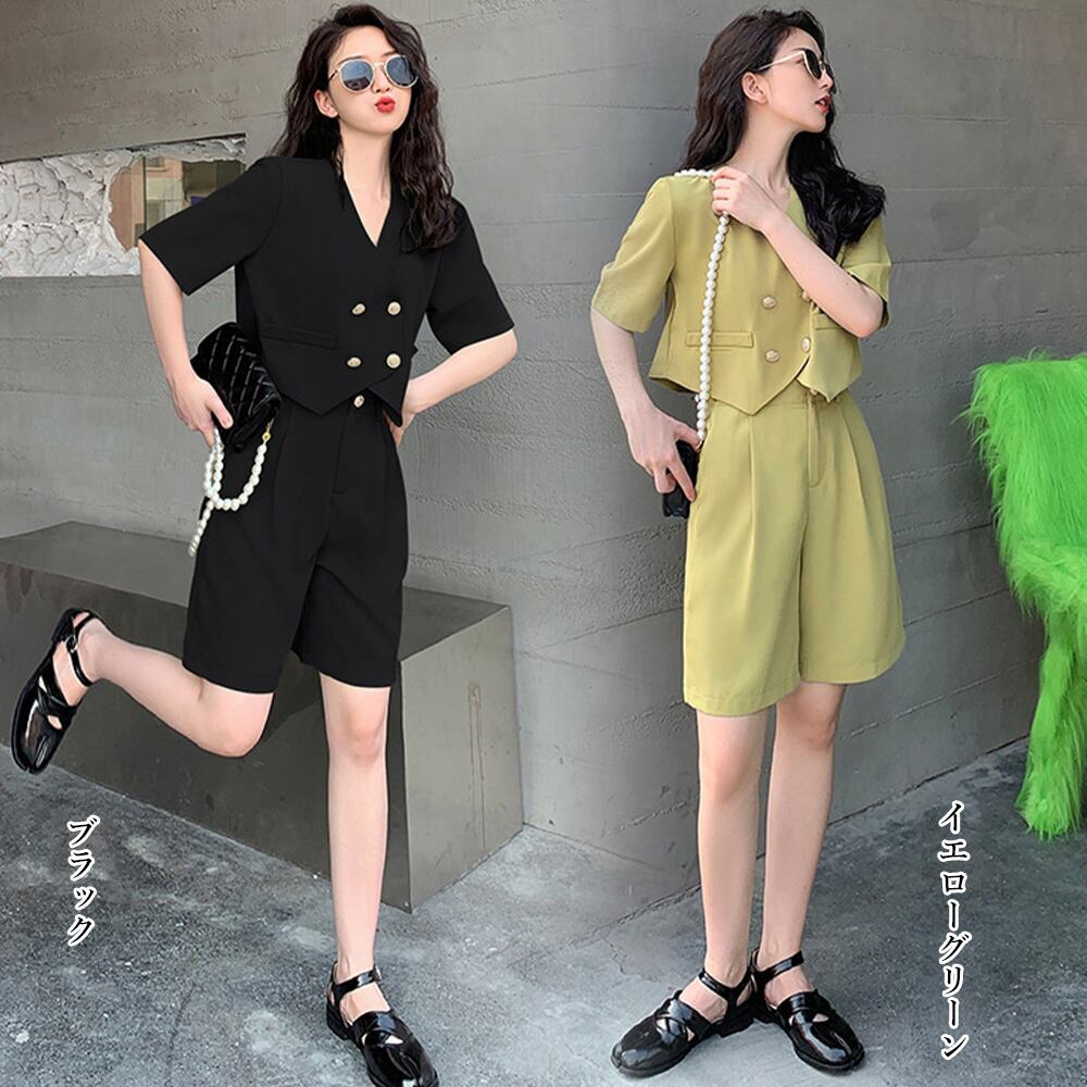 韓国セットアップ 半袖レディース おしゃれアンサンブル 上下セット 着やせ夏服 オフィスカジュアル スペンサージャケット