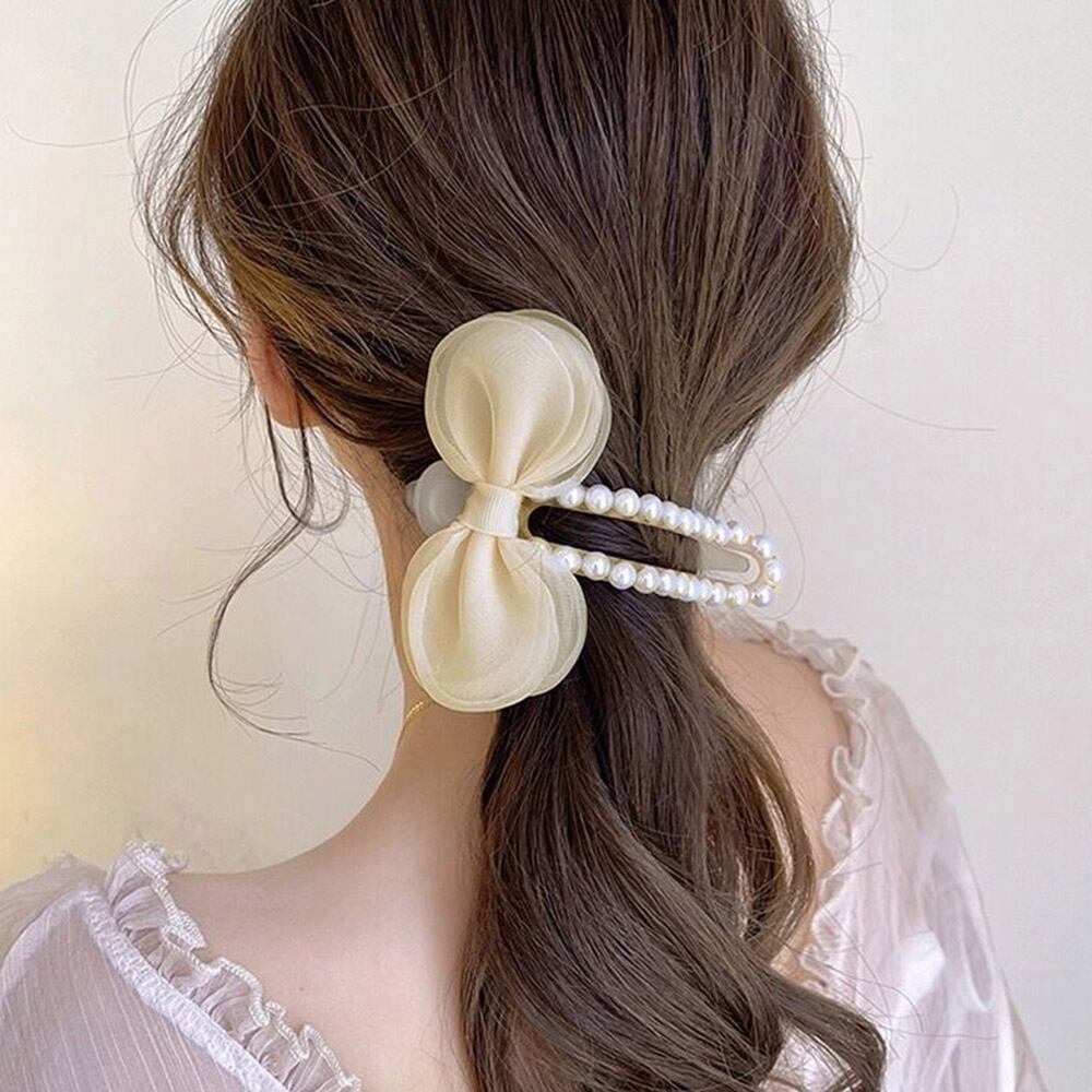 ゴージャスでフェミニンなフェイクパール付きリボンモチーフヘアクリップ。