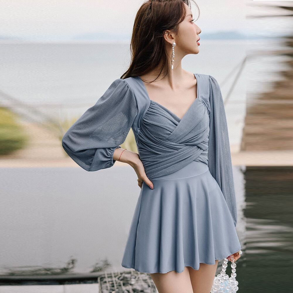 レディース ハイウエスト 韓国風 露出控えめ姫系 フレアスカート水着 プール遊び 海水浴場リゾート 長袖水着 日焼け対策