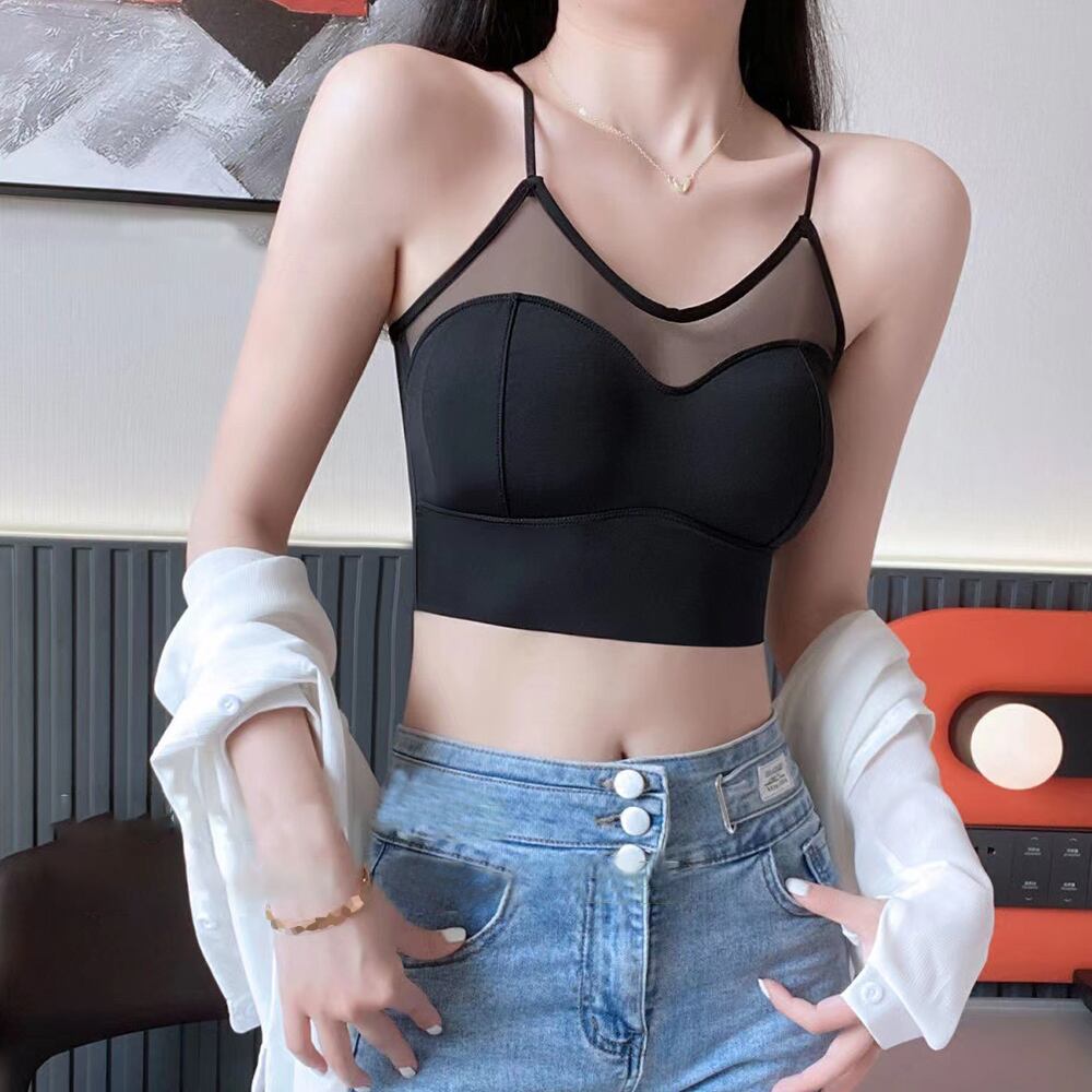 セクシー カップ付きキャミソール バッククロス ノンワイヤーナイトブラ ランジェリースポーツブラ チュール切替 ヨガブラ