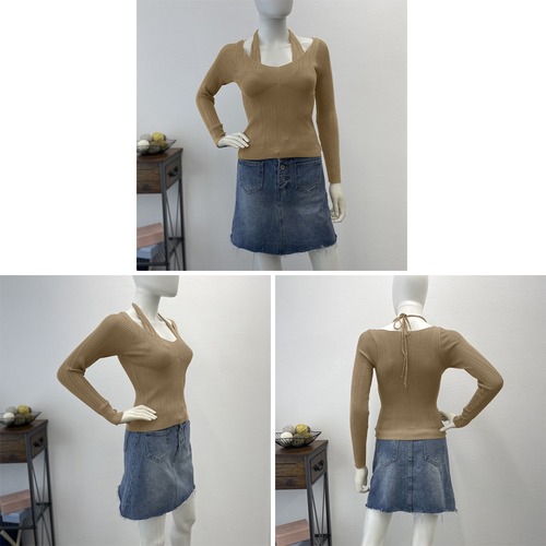 素肌がのぞくセンシュアルさが大人らしいホルターネックデザインリブニットトップス