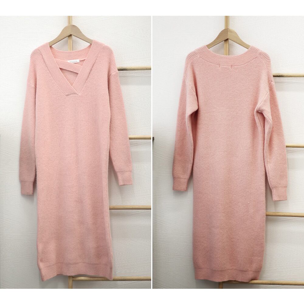 ネックストラップワンピース ドロップショルダーニット vネックワンピース 上品 ゆったりワンピース おしゃれ 体型カバー