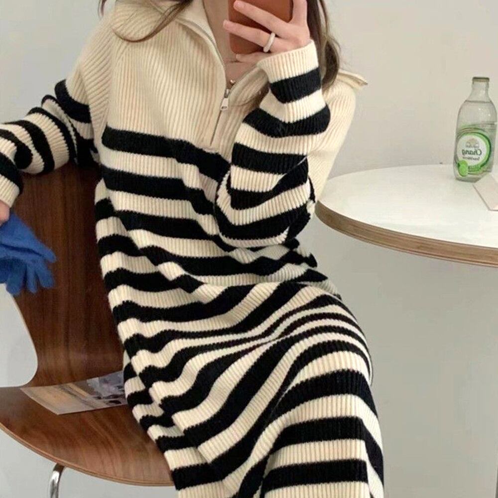中厚手 長袖ワンピース レディース 配色ロングワンピース 暖かい リブニット ポロエリワンピ ゆったり 韓国着やせワンピ