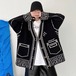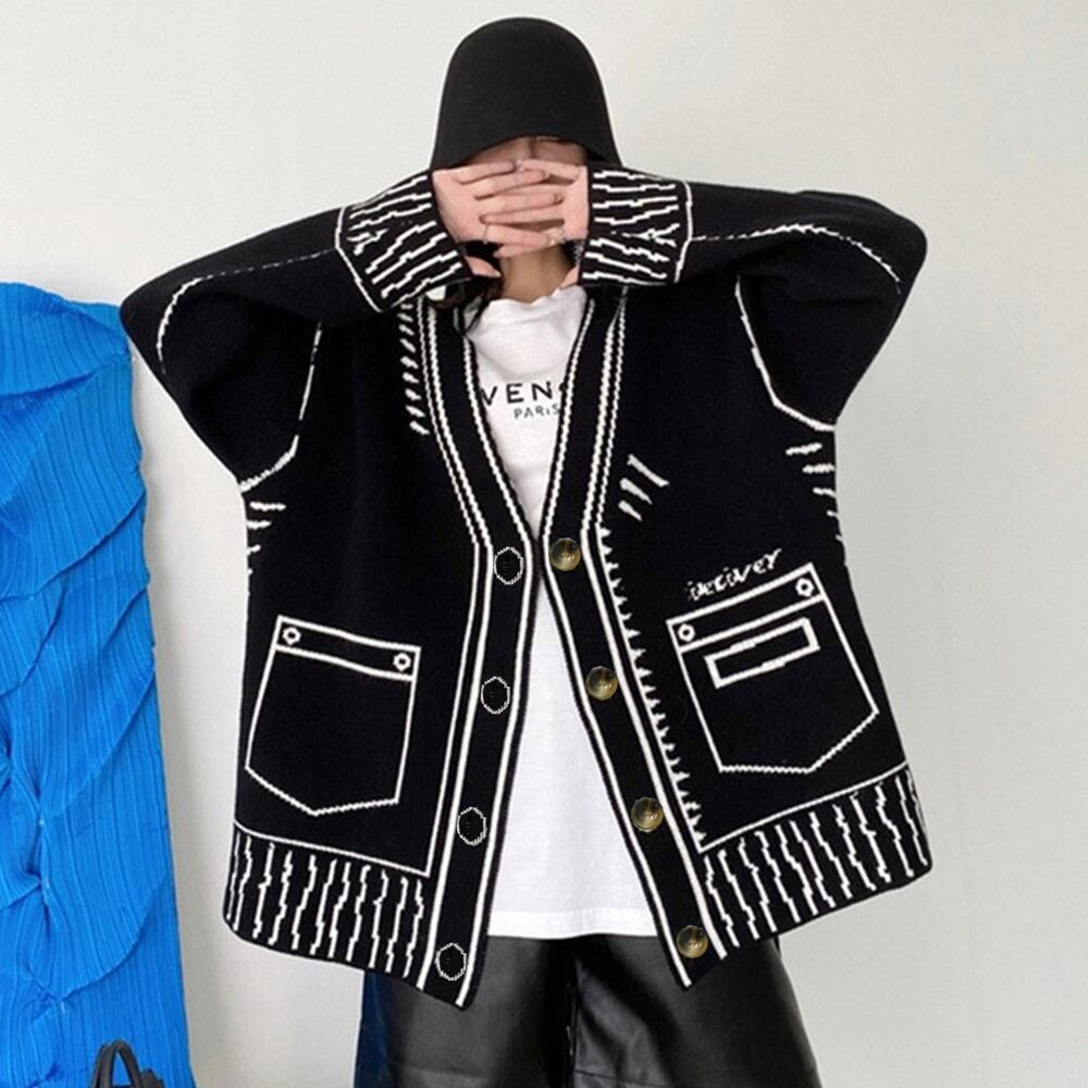 線画風イラストが個性的で他と被らない、落ち着いたモノトーンバイカラーの韓国DESIGNニットカーディガン