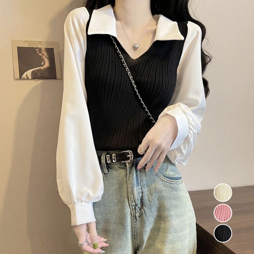 【日本倉庫即納】 ニットブラウス韓国ドッキングニットシャツ