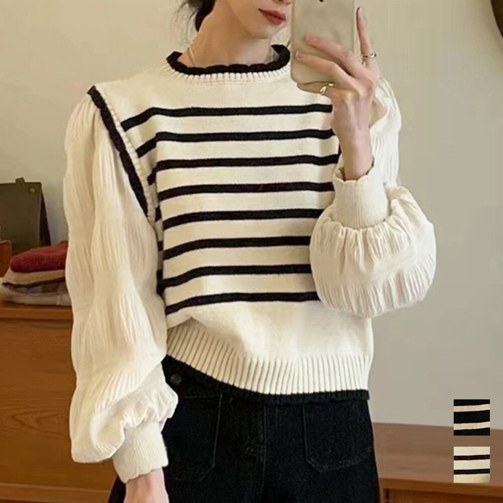 切り替えニットトップス ボーダー柄 ニットプルオーバー長袖 バルーンスリーブ 韓国 レイヤード風ニット クルーネック 黒