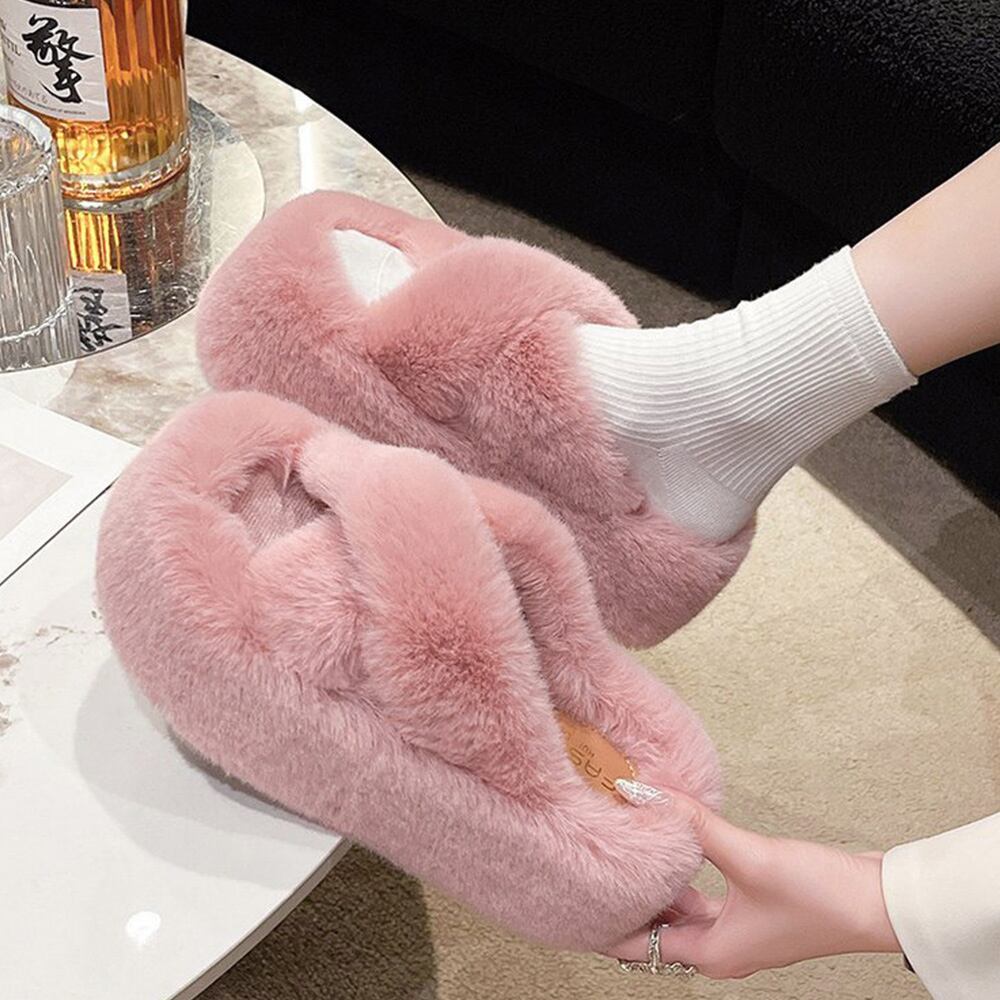暖かくて柔らかい履き心地の良さをもたらし、もふもふの毛足の長いエコファーが大人可愛いクロスベルトサンダル